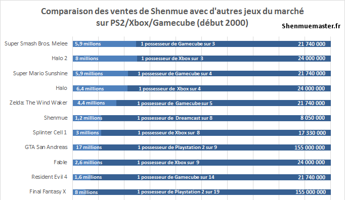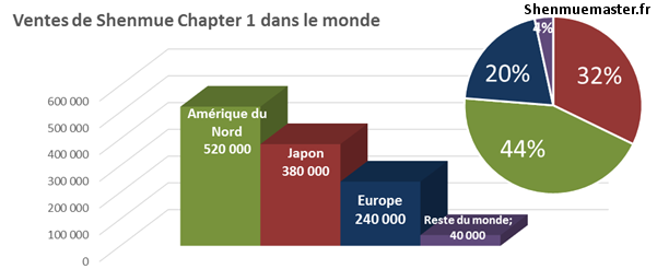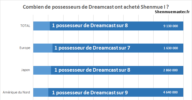 Ces chiffres de ventes sont-ils bons ? La réponse est oui si l’on se réfère au ratio « Nombre de Dreamcast vendues/Nombre d’acheteurs de Shenmue I ». En se basant sur un parc de Dreamcast vendus de 9,13 millions de consoles dans le monde (source : VG Sales), on en arrive à la conclusion suivante : en moyenne dans le monde, 1 acheteur de Dreamcast sur 8 a acheté Shenmue I.