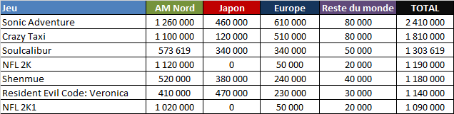 Quid des autres jeux Dreamcast ? Shenmue fait partie du cercle très fermé des 7 jeux qui ont dépassé la barre du 1 million de ventes, Sonic Adventure trustant la première place avec 2,4 millions. On peut regretter la non-traduction de Shenmue dans les principales langues européennes qui a certainement eu un impact sur les ventes du jeu en Europe, ainsi que la campagne marketing européenne très discrète à l’époque.
